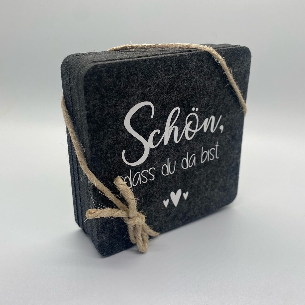 Set bestehend aus 6 Filzuntersetzern in 2 verschiedenen Formen – rund oder quadratisch mit den Maßen 10×10 cm bzw. 10cm Durchmesser.