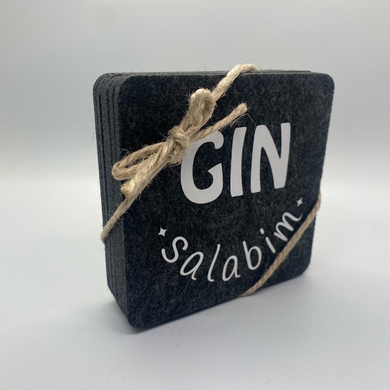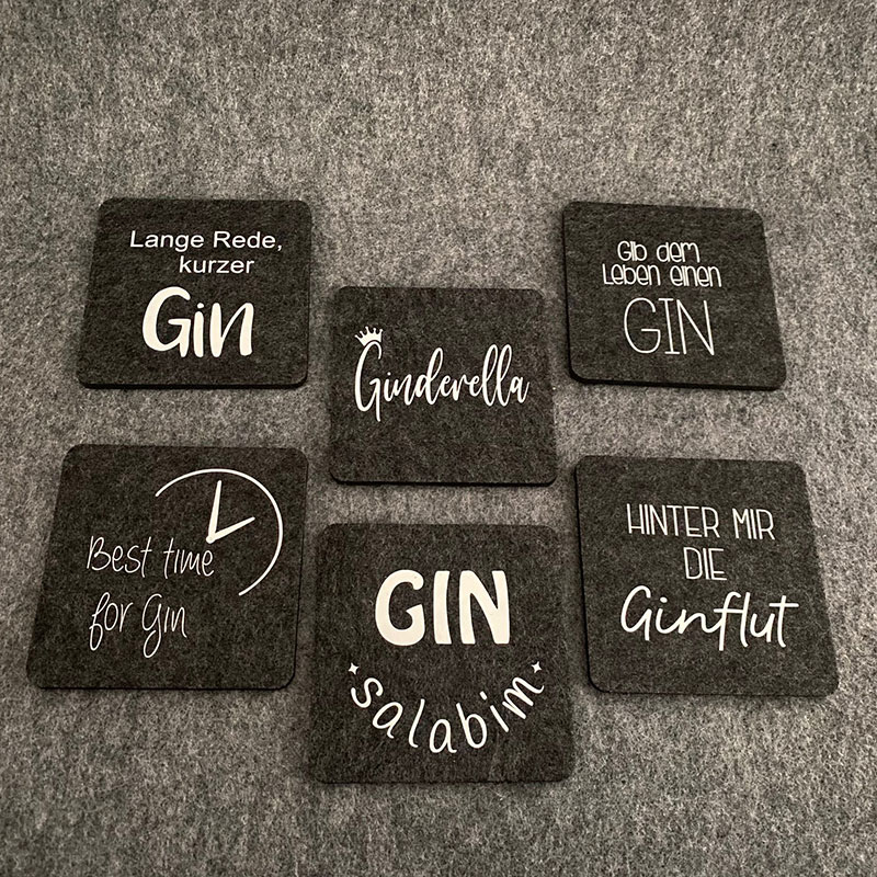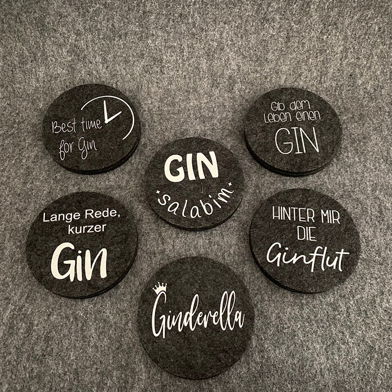 Set für Ginliebhaber bestehend aus 6 Filzuntersetzern in 2 verschiedenen Formen – rund oder quadratisch mit den Maßen 10×10 cm bzw. 10cm Durchmesser.